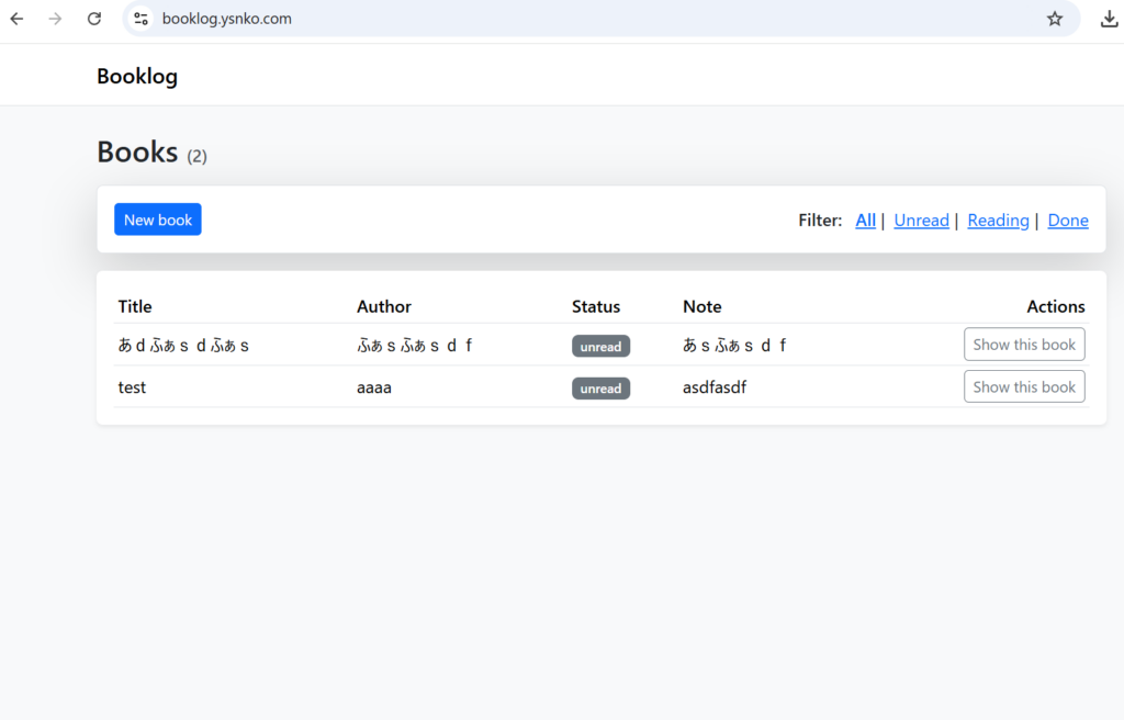 読んだ本(タイトル/著者/ステータス/メモ)を登録・一覧・詳細表示できるシンプルな読書ログです。