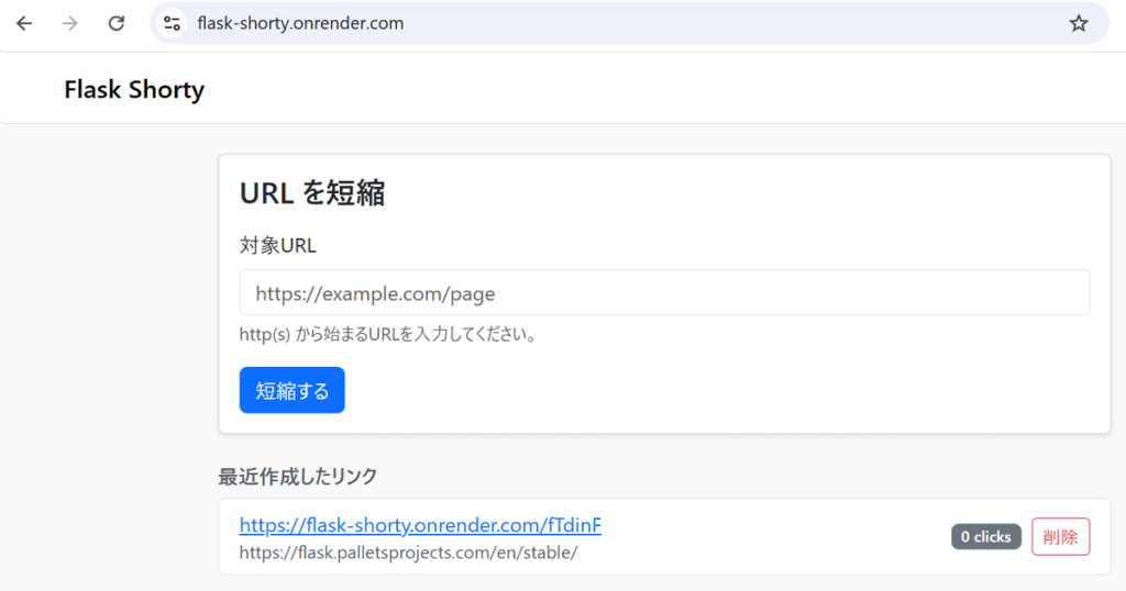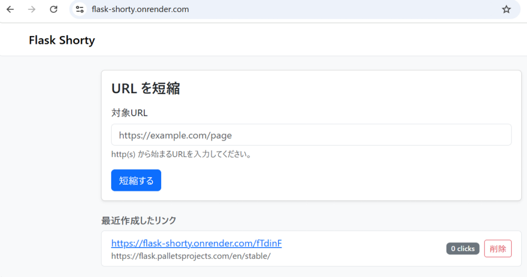 トップページには直近で作成された短縮URLの一覧クリック数が表示され、削除ボタンで不要な短縮をDBから消せます。
